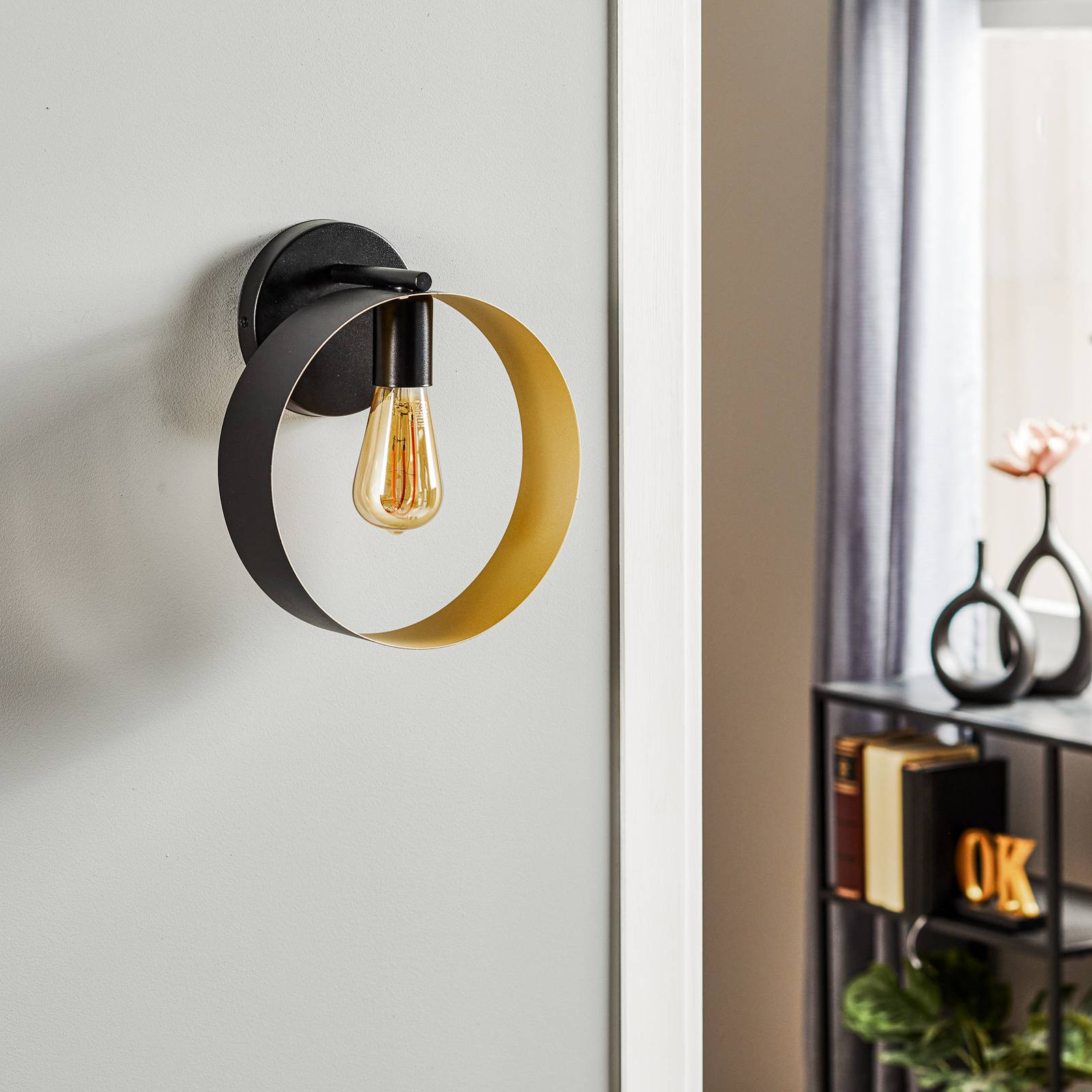 SIGMA Nástěnné svítidlo Hula v kroužkovém designu, černá/zlatá barva, Obývací pokoj / jídelna, Ocel, E27, 60W, L: 25 cm, K: 29cm
