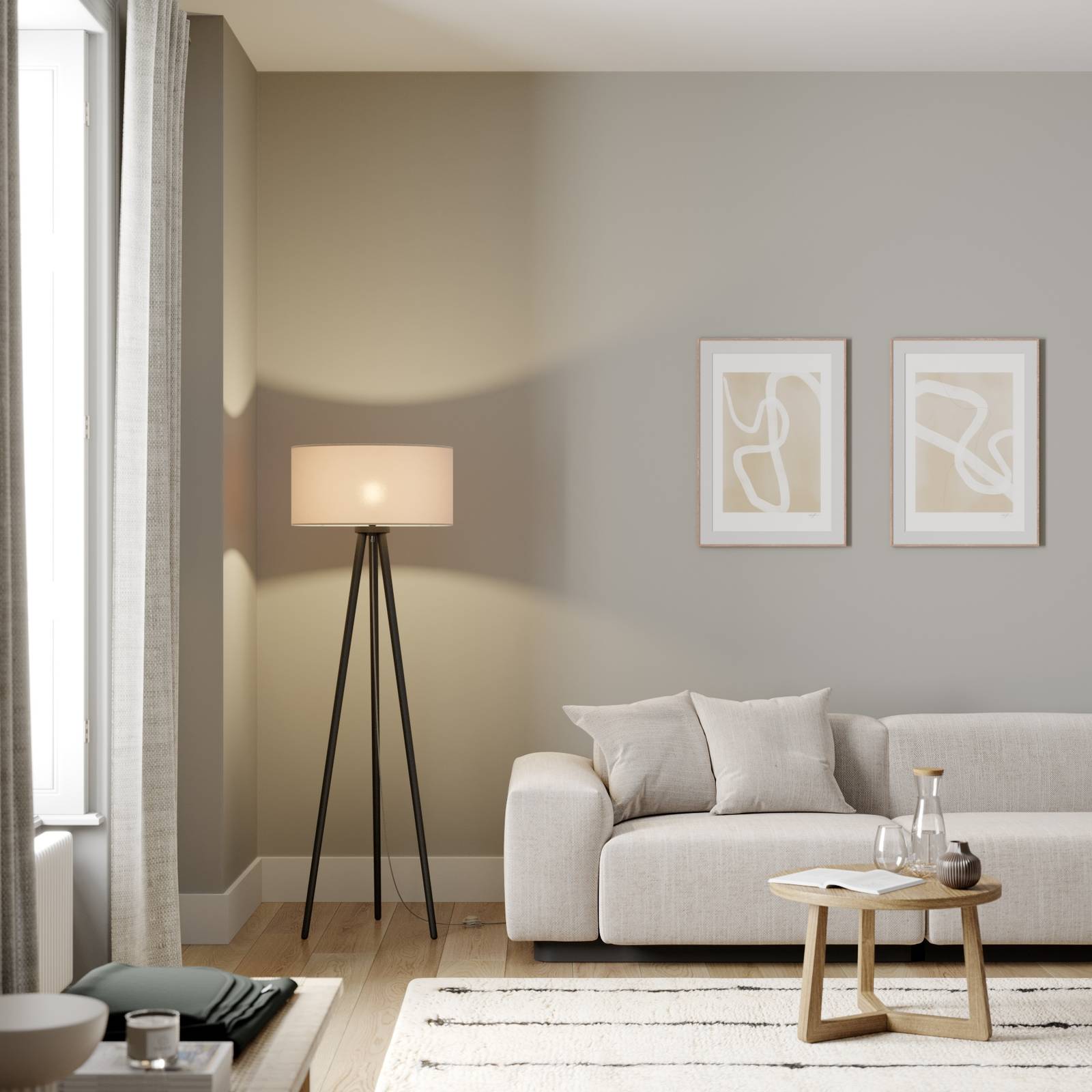 BRITOP Stojací lampa Mabia, trojnožka, šedá/černá, Obývací pokoj / jídelna, textil, bukové dřevo, E27, 60W, K: 160cm