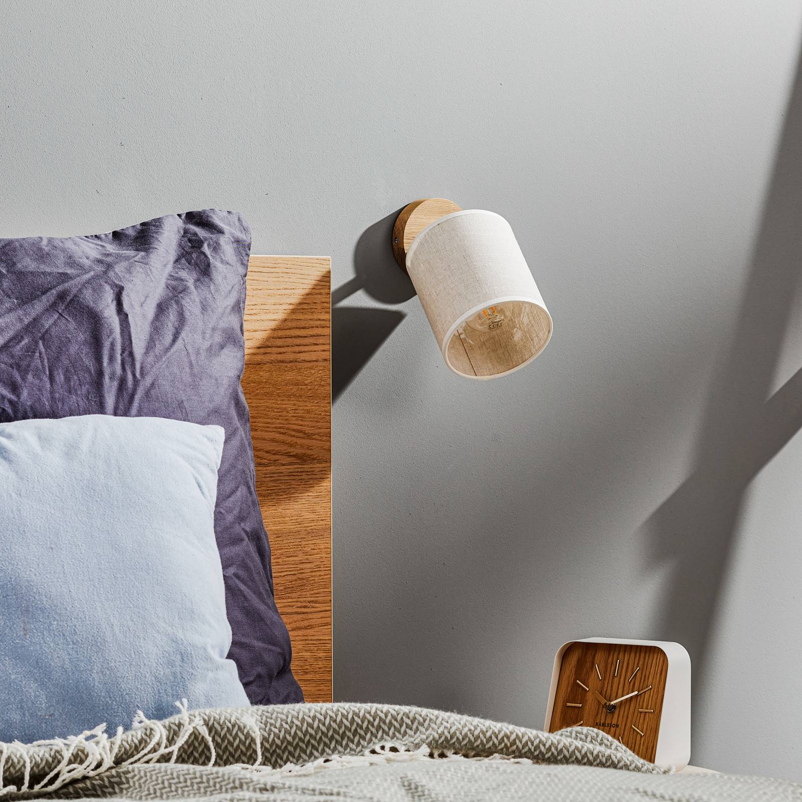 BRITOP Nástěnné světlo Canvas, béžová, textil, Ø 13cm, Obývací pokoj / jídelna, dubové dřevo, len, E27, 25W