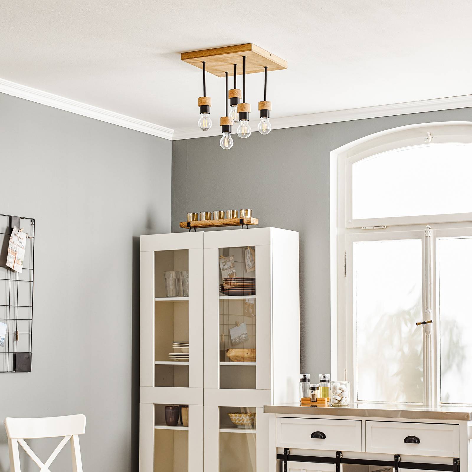 BRITOP Stropní svítidlo Millume dub čtverec 5 zdrojů, Obývací pokoj / jídelna, dubové dřevo, kov, E27, 40W, P: 34 cm, L: 34 cm, K: 43cm