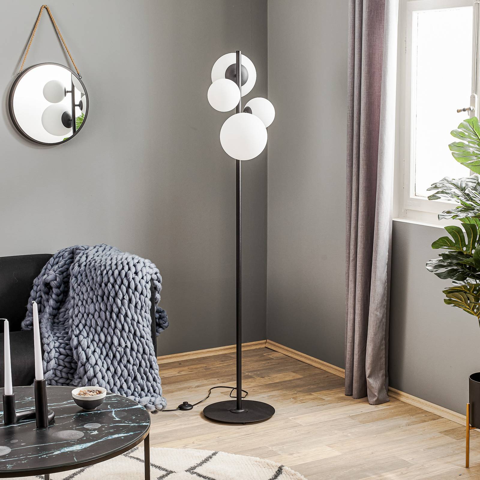 ALDEX Stojací lampa Bloom, čtyři zdroje, černá, Obývací pokoj / jídelna, kov, sklo, E27, 60W, P: 49 cm, L: 35 cm, K: 161cm