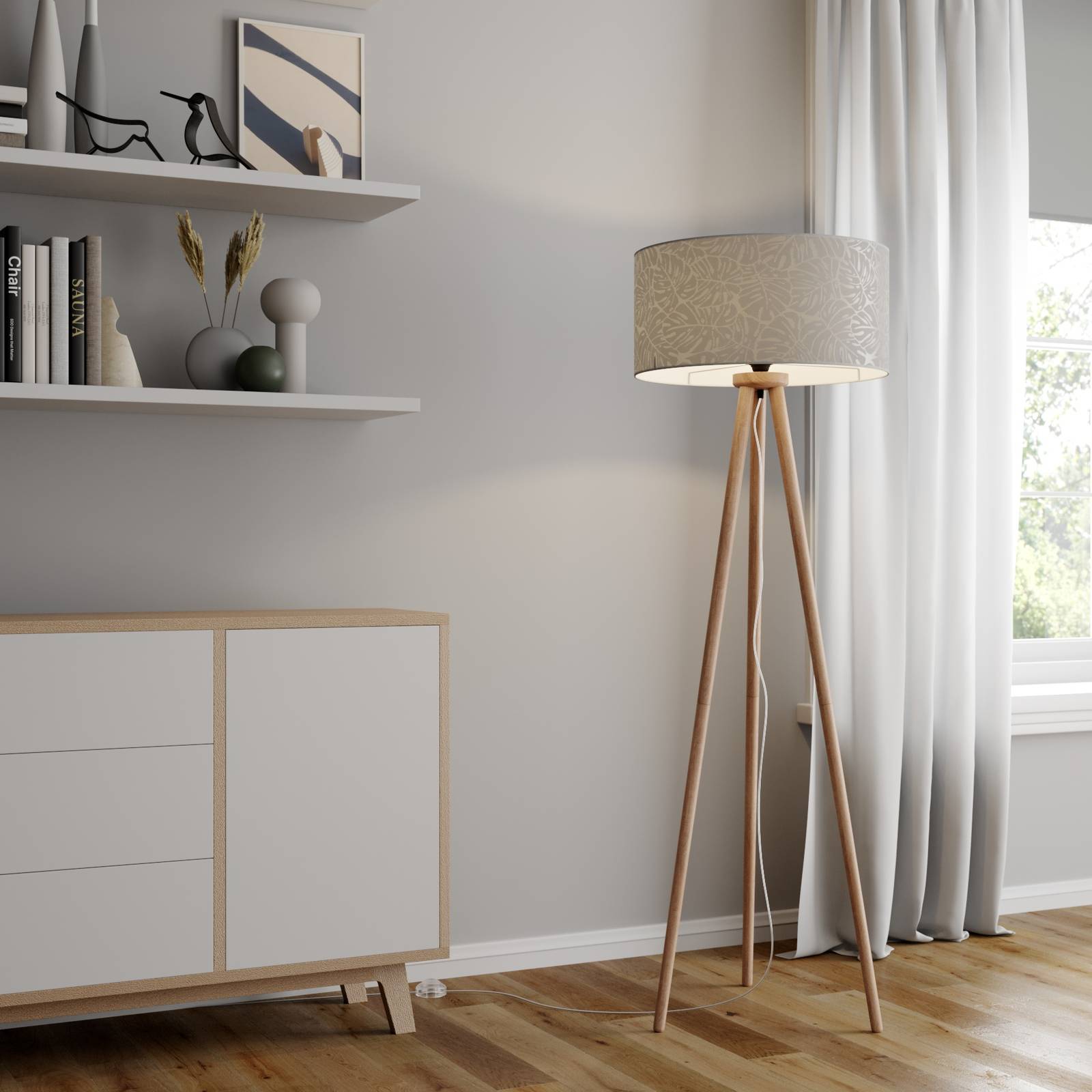 BRITOP Stojací lampa Corralee třínožka dřevo, šedá, Obývací pokoj / jídelna, textil, dub, E27, 60W, K: 154cm