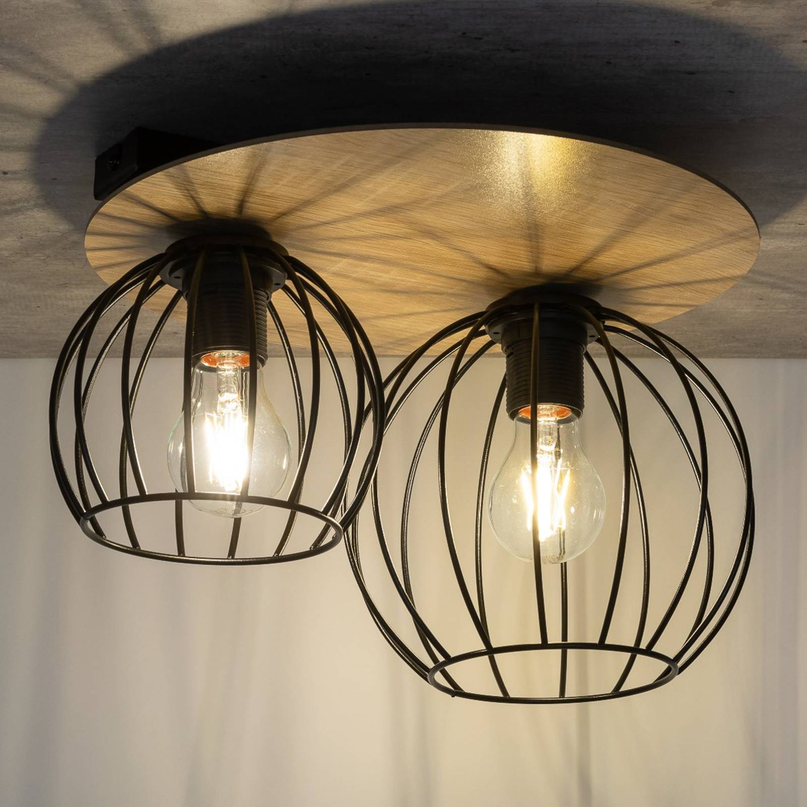 SIGMA Stropní světlo Malin, dřevěná lišta kulatá 2zdroje, Obývací pokoj / jídelna, ocel, dubové dřevo, plast, E27, 60W, P: 37 cm, L: 33 cm, K: 24cm