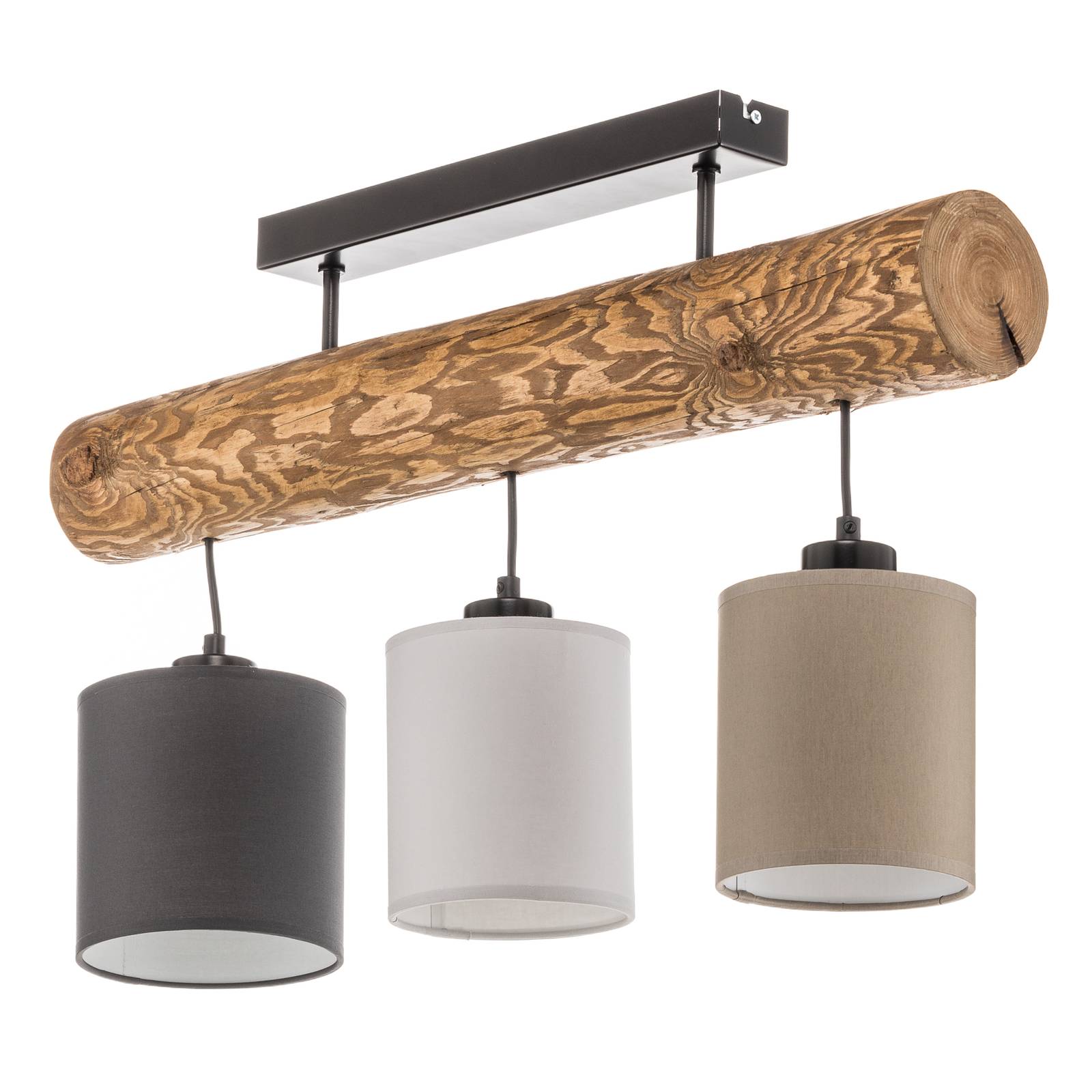 BRITOP Stropní světlo Sachiko, dřevěný trám tři stínidla, Obývací pokoj / jídelna, borové dřevo, textil, kov, E27, 25W, P: 70 cm, K: 40cm