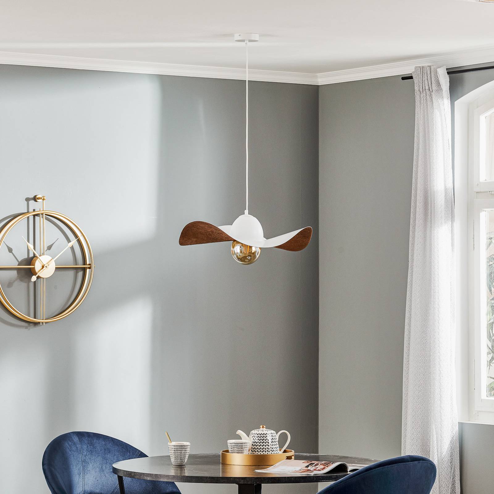 SIGMA Závěsné světlo Jil, stínidlo zakřivené, bílá/měď, Obývací pokoj / jídelna, kov, textil, plast, minerální materiál, E27, 60W