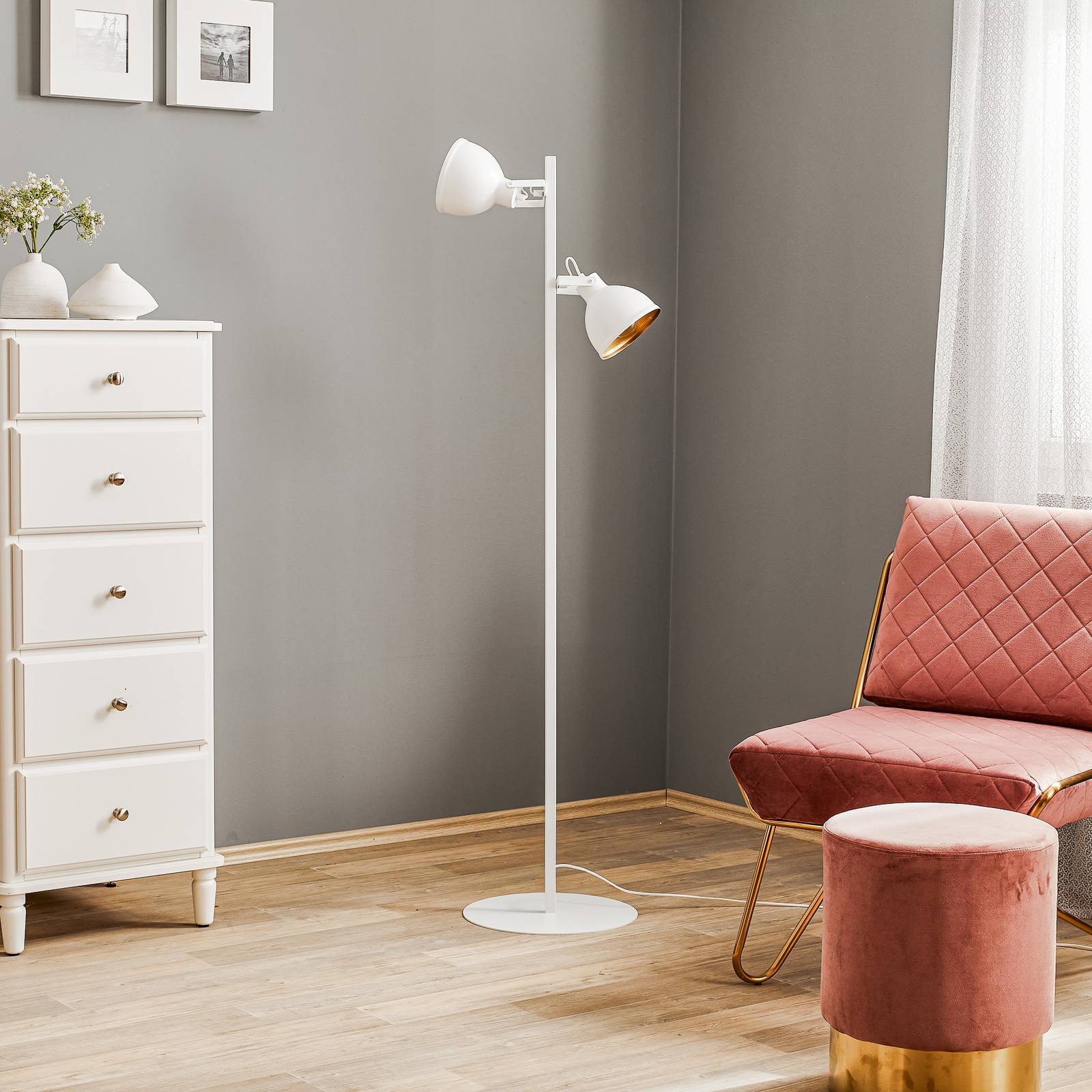 SIGMA Stojací lampa Trial, 2 stínidla otočná, bílá/zlatá, Obývací pokoj / jídelna, ocel, E27, 60W, K: 150cm