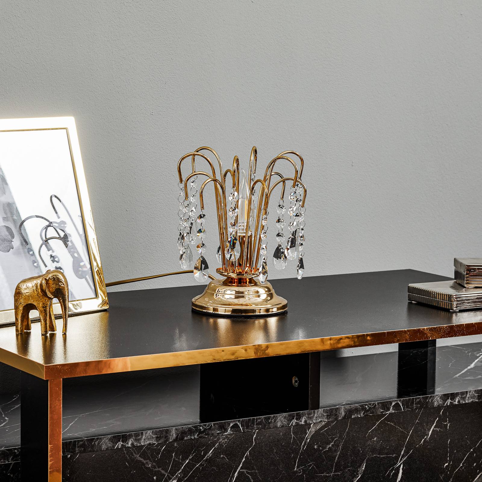 ONLI Stolní lampa Pioggia s křišťálovým deštěm, 26 cm, zlatá, Obývací pokoj / jídelna, Kov, křišťálové sklo K9, E14, 6W, K: 26cm
