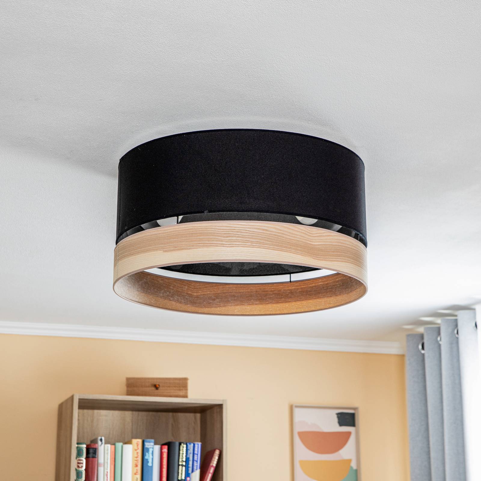 Euluna Levo stropní světlo Ø60, jasan světlý/černá, Obývací pokoj / jídelna, textil, dýha, fólie, kov, E27, 15W, K: 30cm