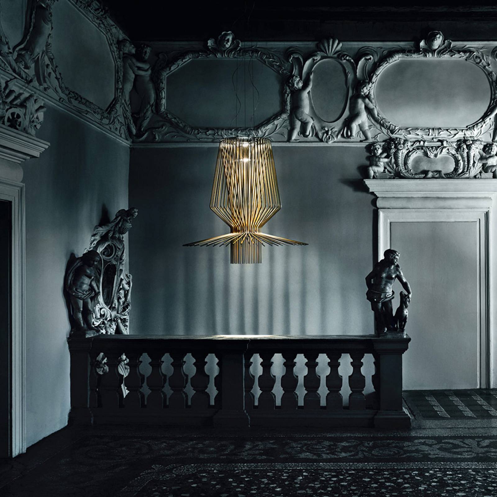 Foscarini Allegro Assai LED závěsné světlo, zlatá, Obývací pokoj / jídelna, hliník lakovaný, kov pochromovaný, 50.4W, K: 136cm
