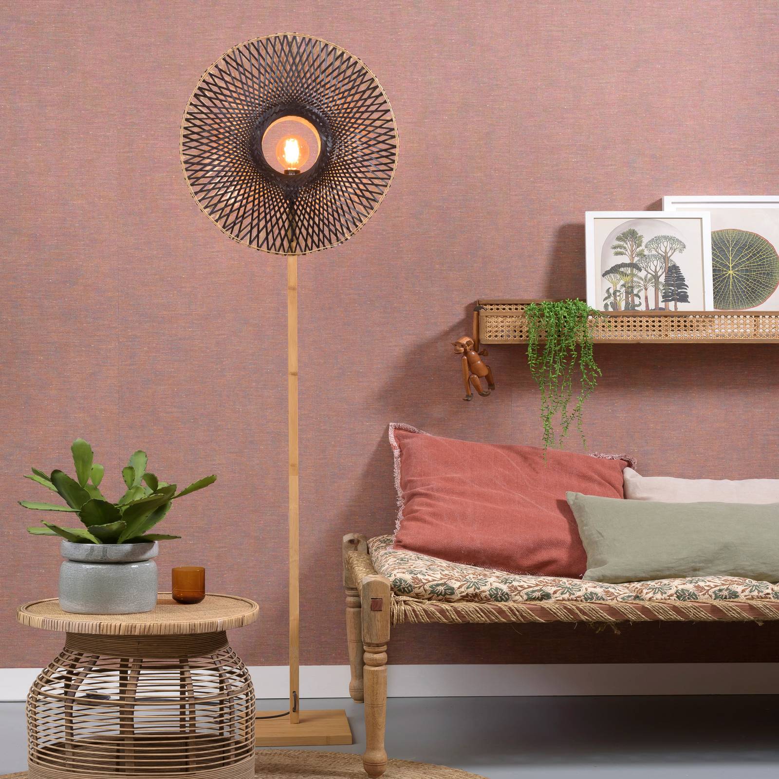 Good & Mojo GOOD MOJO Kalimantan stojací lampa, Ø 60cm, Obývací pokoj / jídelna, bambus, textil, E27, 60W, K: 180cm