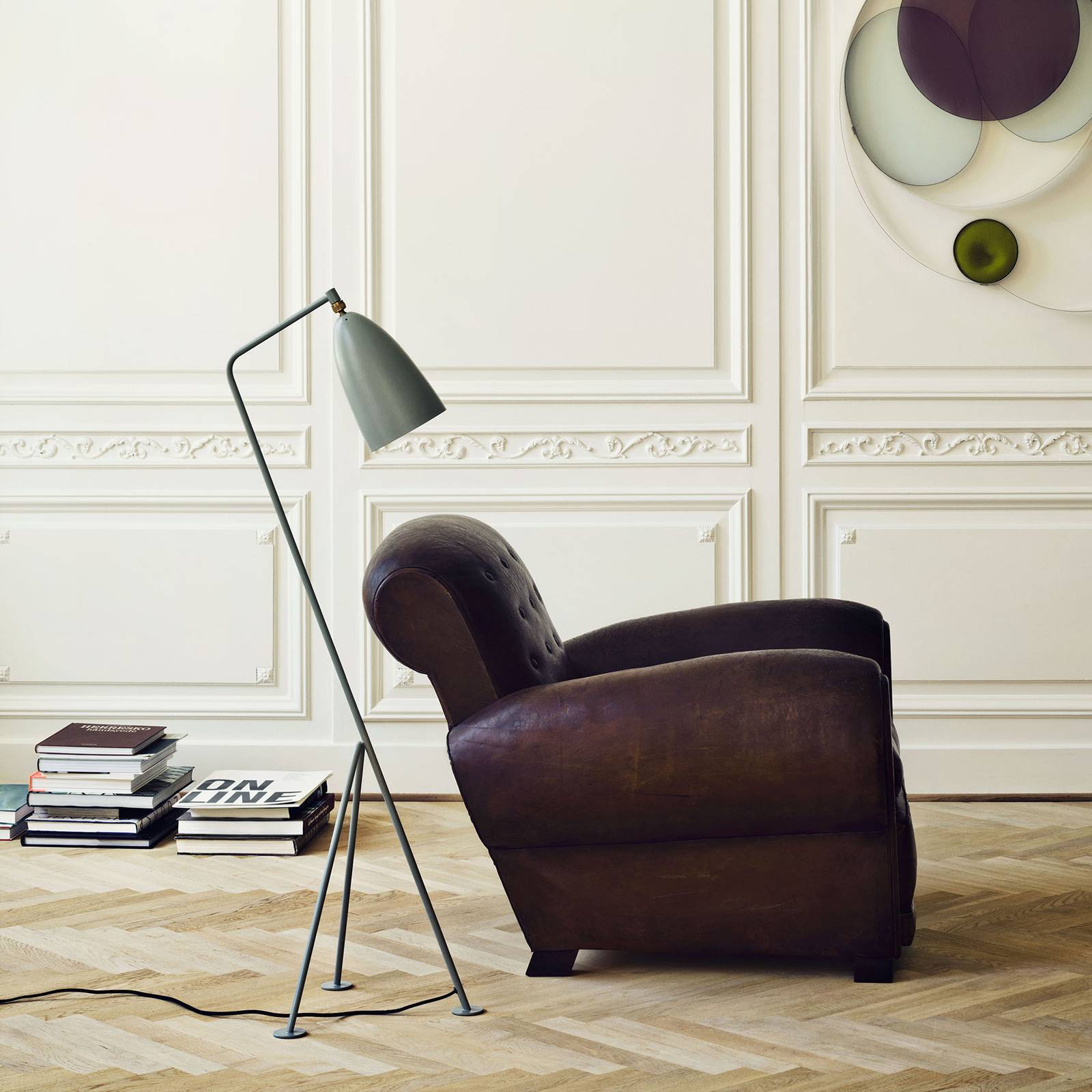 GUBI Gräshoppa trojnohá stojací lampa šedá, Obývací pokoj / jídelna, ocel s práškovým lakem, mosaz, E14, 40W, K: 125.5cm