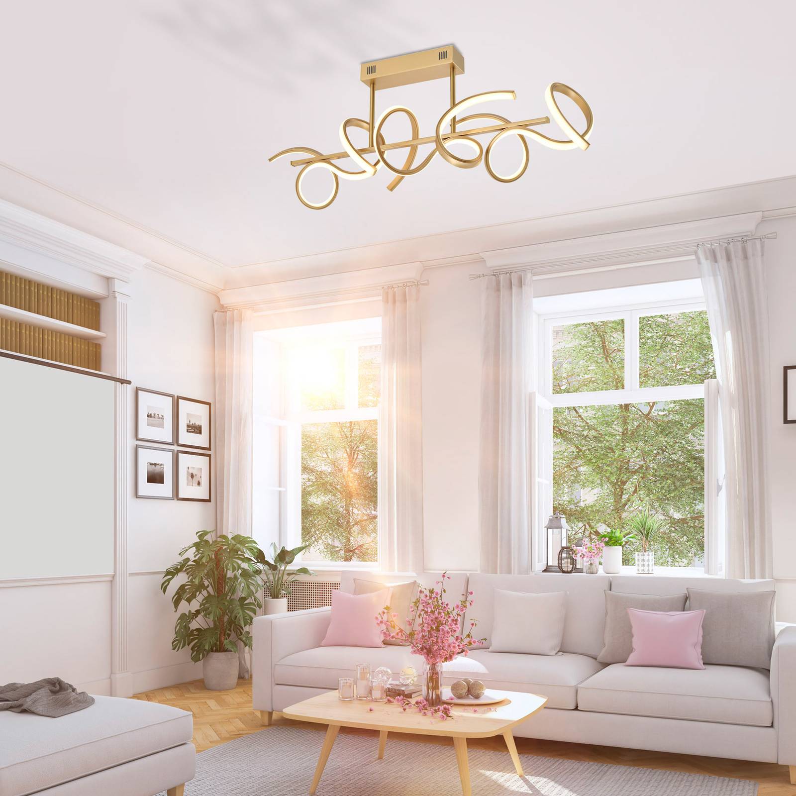 JUST LIGHT. LED stropní světlo Curls, mosaz matná, Obývací pokoj / jídelna, hliník, železo, plast, 8.6W, P: 82 cm, L: 21 cm, K: 30cm