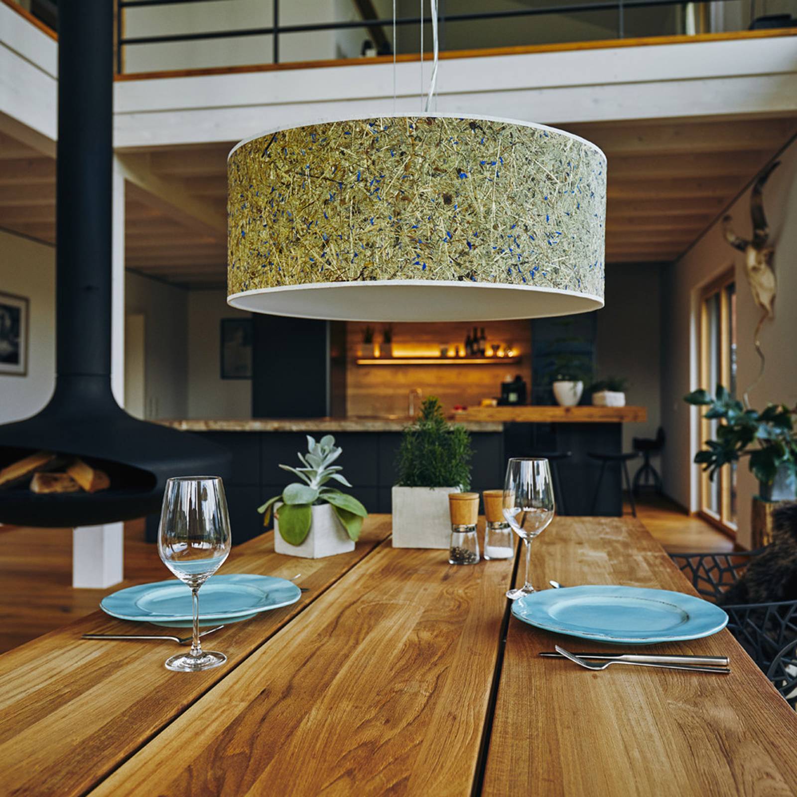 LeuchtNatur Závěsná lampa Discus 55cm chrpově bílá, Obývací pokoj / jídelna, Alpské seno, kov, E27, 10W, K: 20cm