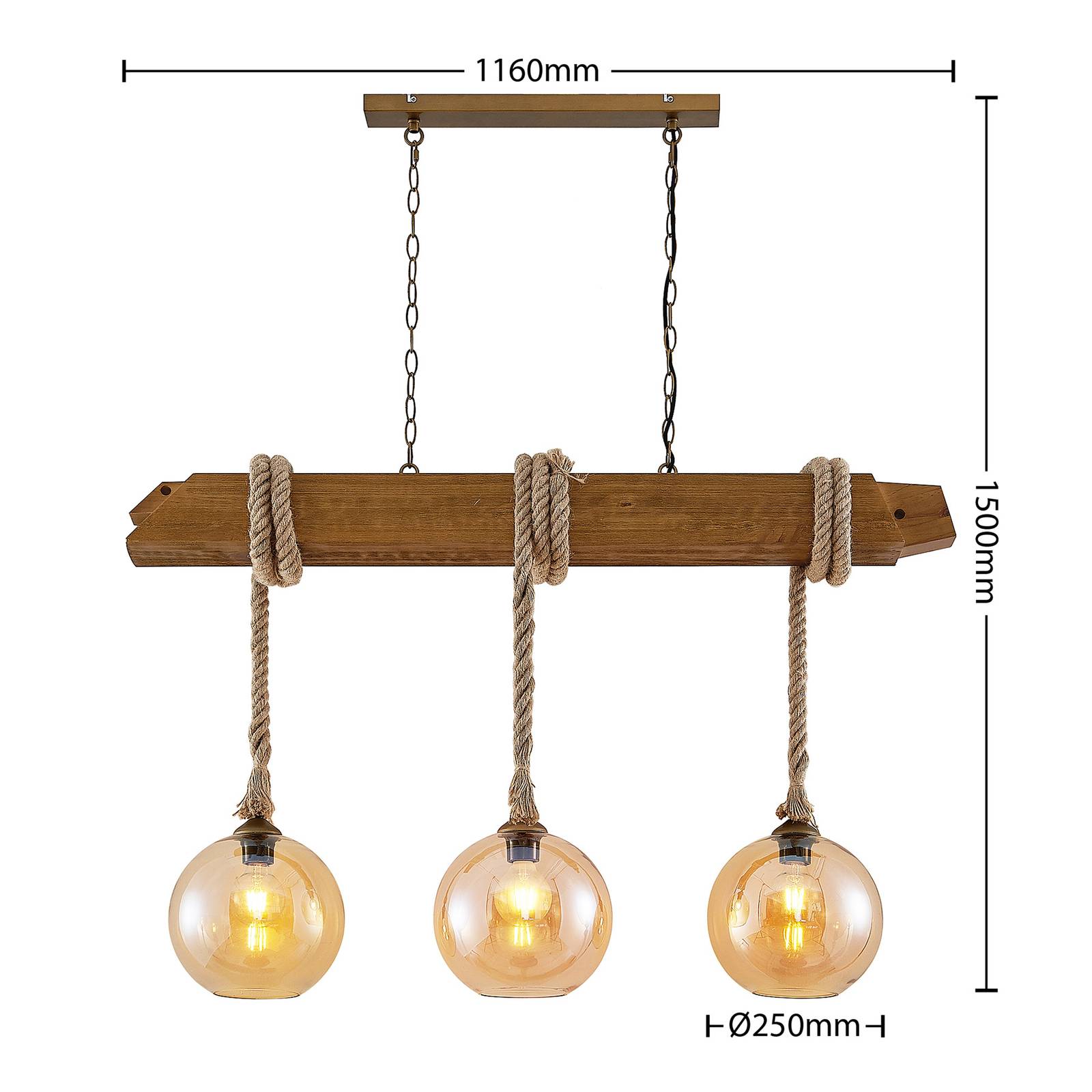 Lucande Mevan závěsné světlo, dřevěný trám, jantar, Obývací pokoj / jídelna, železo, borovice, sklo, E27, 15W, P: 116 cm, L: 25 cm, K: 23cm