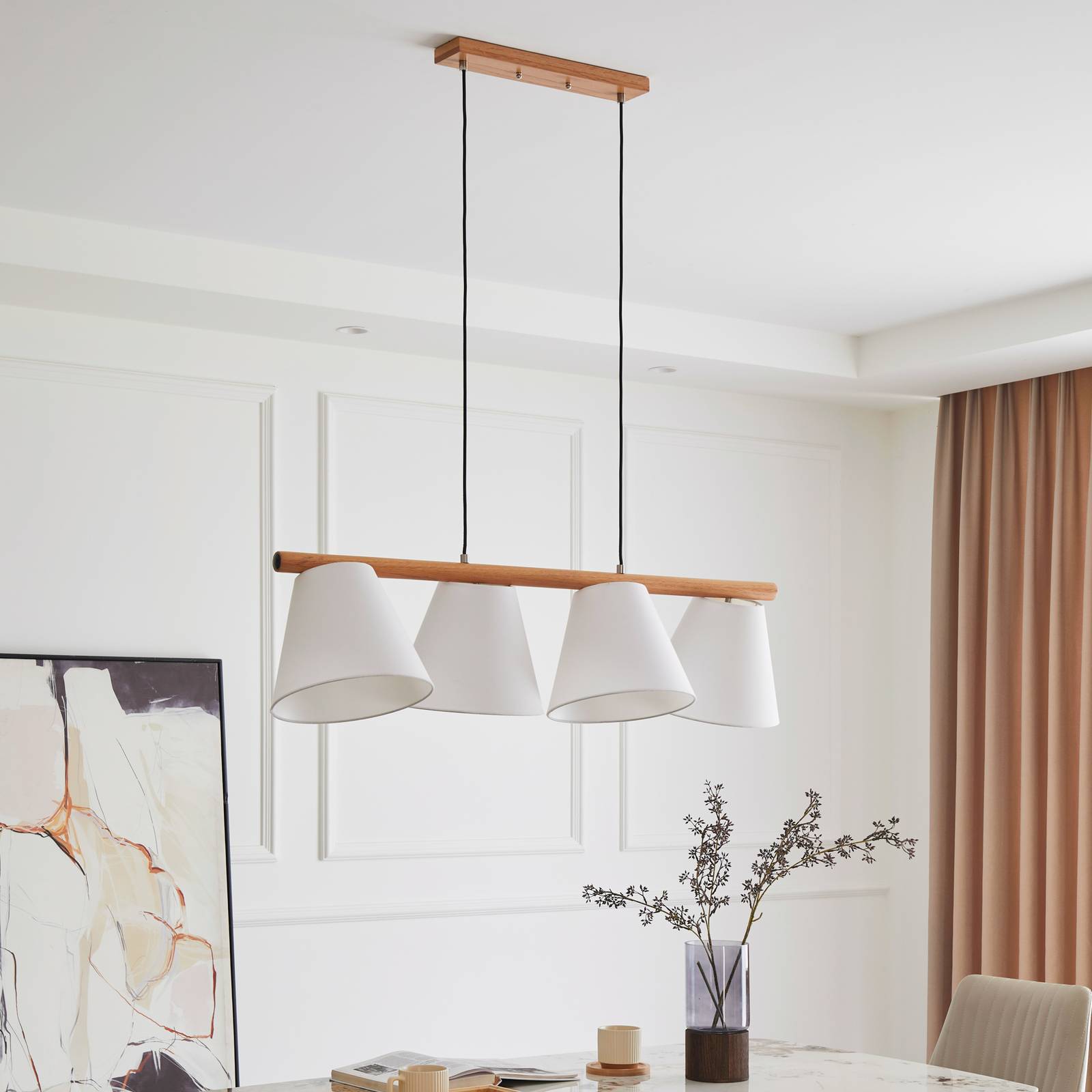 Lucande Závěsné svítidlo Jinda, dřevo, bílá látka, Obývací pokoj / jídelna, Textil, dubové dřevo, E27, 60W, P: 120 cm, L: 38 cm, K: 21.5cm