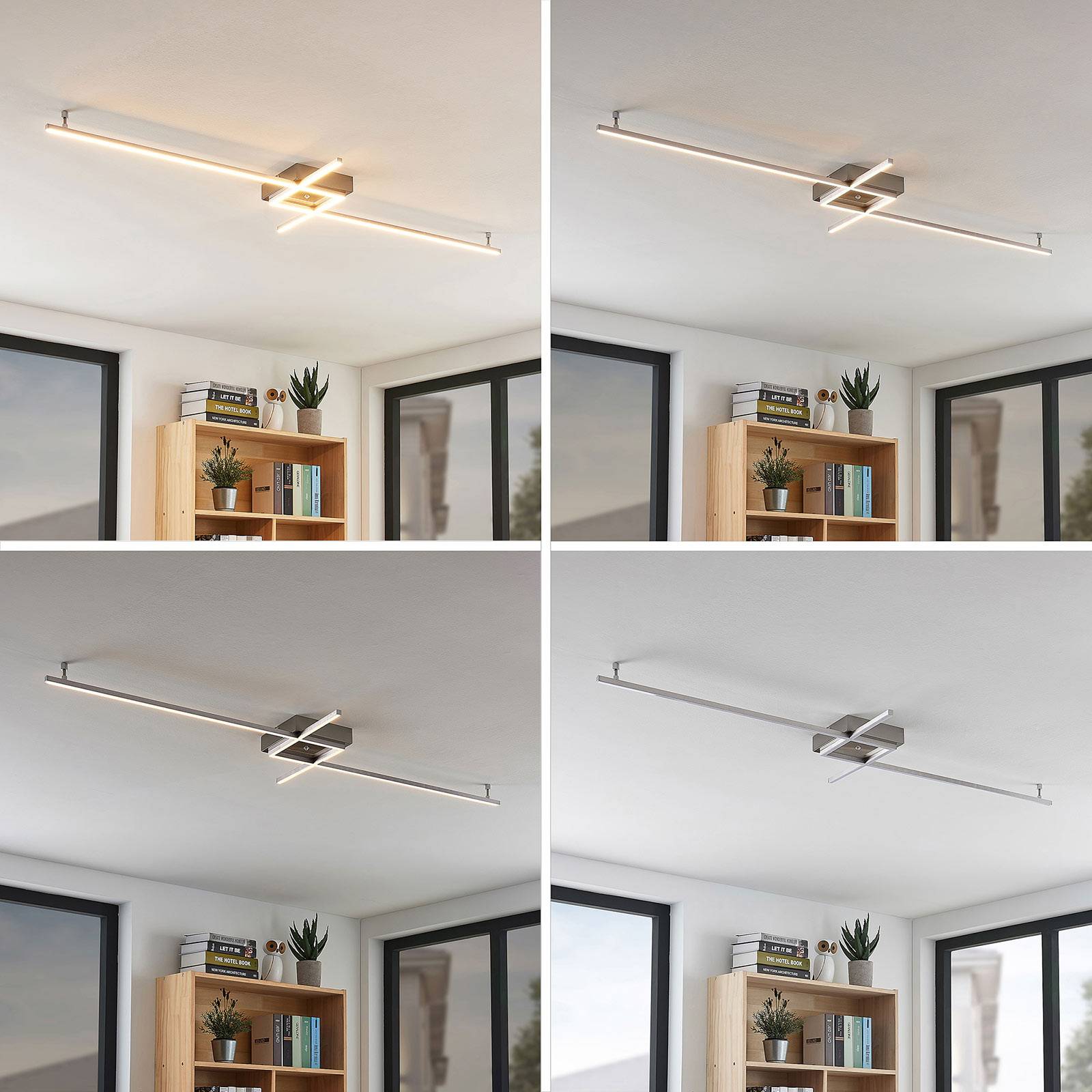 Lucande Keki – stropní LED svítidlo s dálkovým ovladačem, Obývací pokoj / jídelna, nerezová ocel, akryl, 26.4W, P: 142.6 cm, L: 49 cm, K: 5.3cm