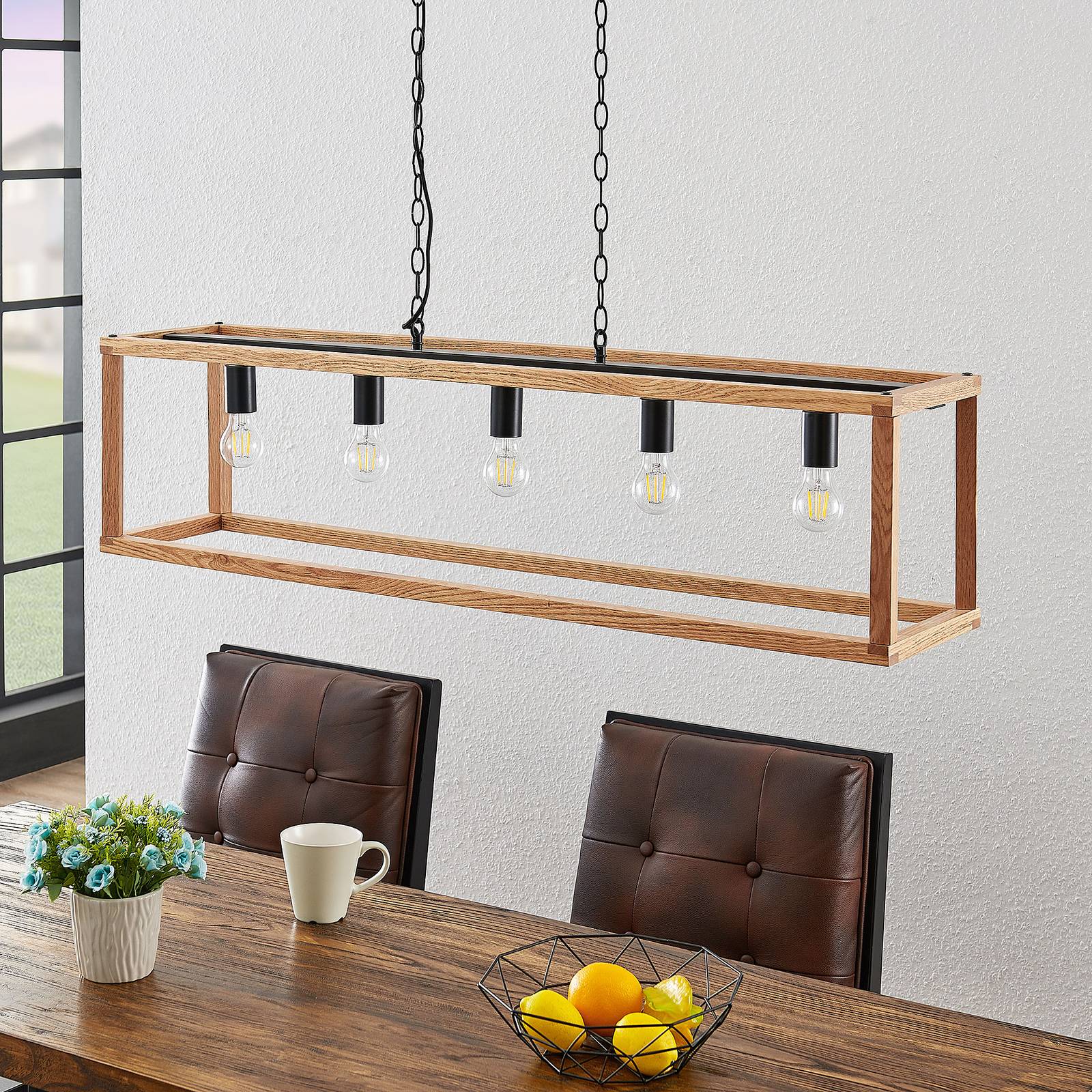 Lucande Sedrik závěsné světlo, pětižárovkové, Obývací pokoj / jídelna, kov, dubové dřevo, E27, 60W, P: 118 cm, L: 25 cm, K: 30cm