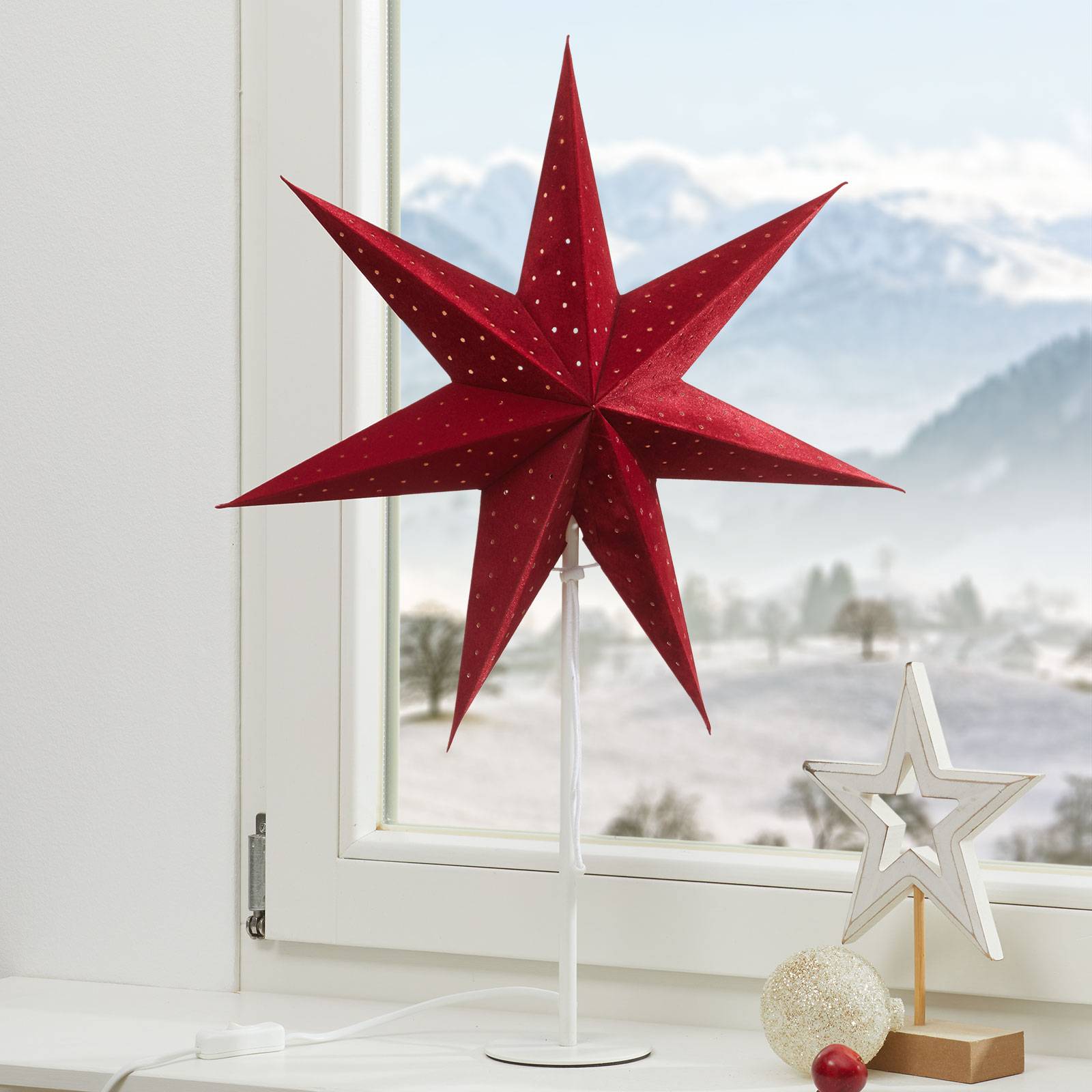 Markslöjd Stojací hvězda Clara, červená, noha bílá, kov, papír, E14, 25W, P: 45 cm, L: 20 cm, K: 65cm