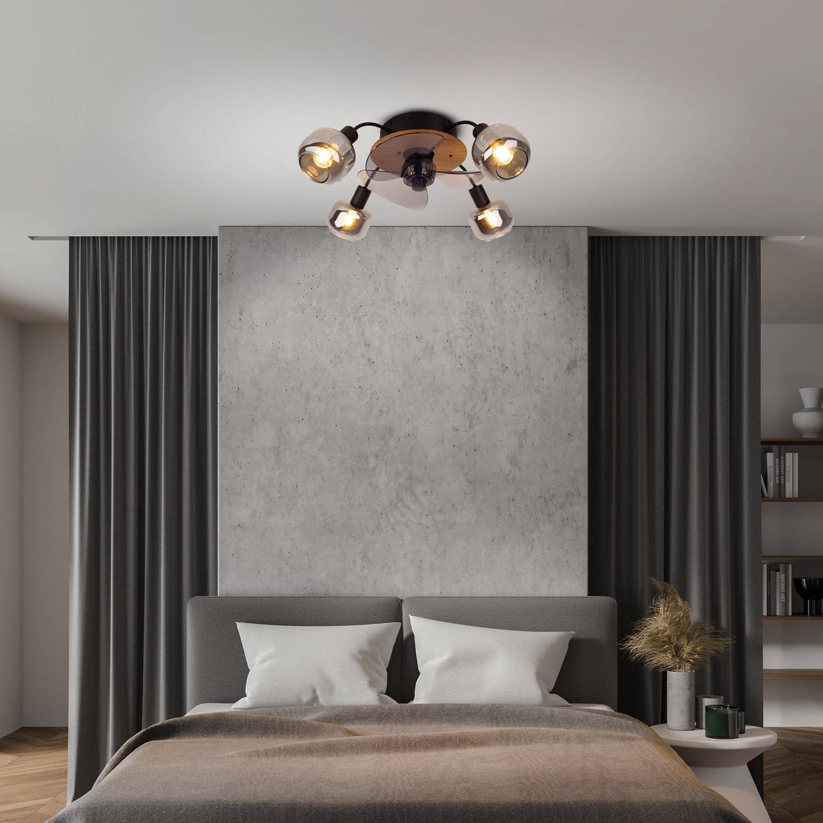 Näve Stropní ventilátor Fumoso, 4 E14 světlo kouřové, Obývací pokoj / jídelna, železo, sklo, plast, dřevo, E14, 10W, P: 51 cm, L: 51 cm, K: 20cm