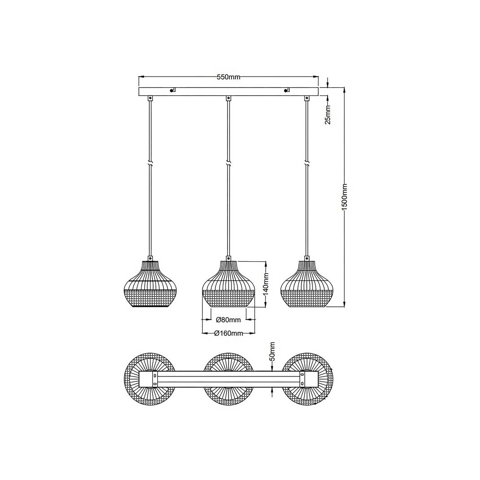Nino Lightning Závěsné světlo Milena, ratanové stínidlo, 3 zdroje, Obývací pokoj / jídelna, ratan, kov, E27, 40W, P: 55 cm