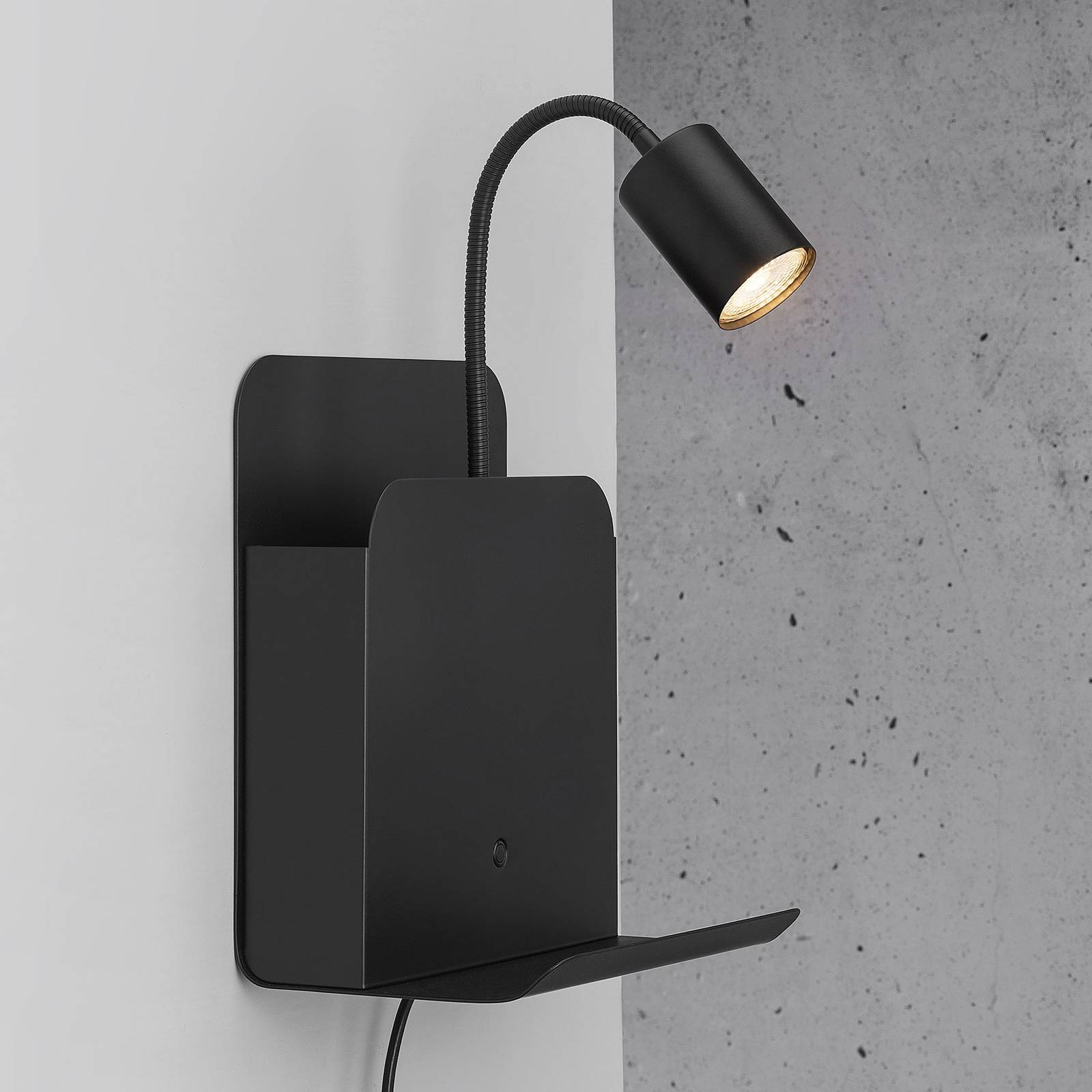 Nordlux Nástěnné světlo Roomi s policí a USB, černá, Ložnice, kov, GU10, 35W, L: 24.8 cm, K: 28.2cm