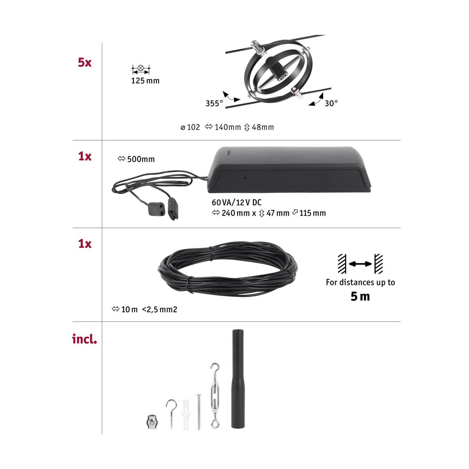 Paulmann Wire Cardan lankový systém, 5x, 5 m černá, Chodba, kov, GU5.3 / MR16, 10W, P: 500 cm