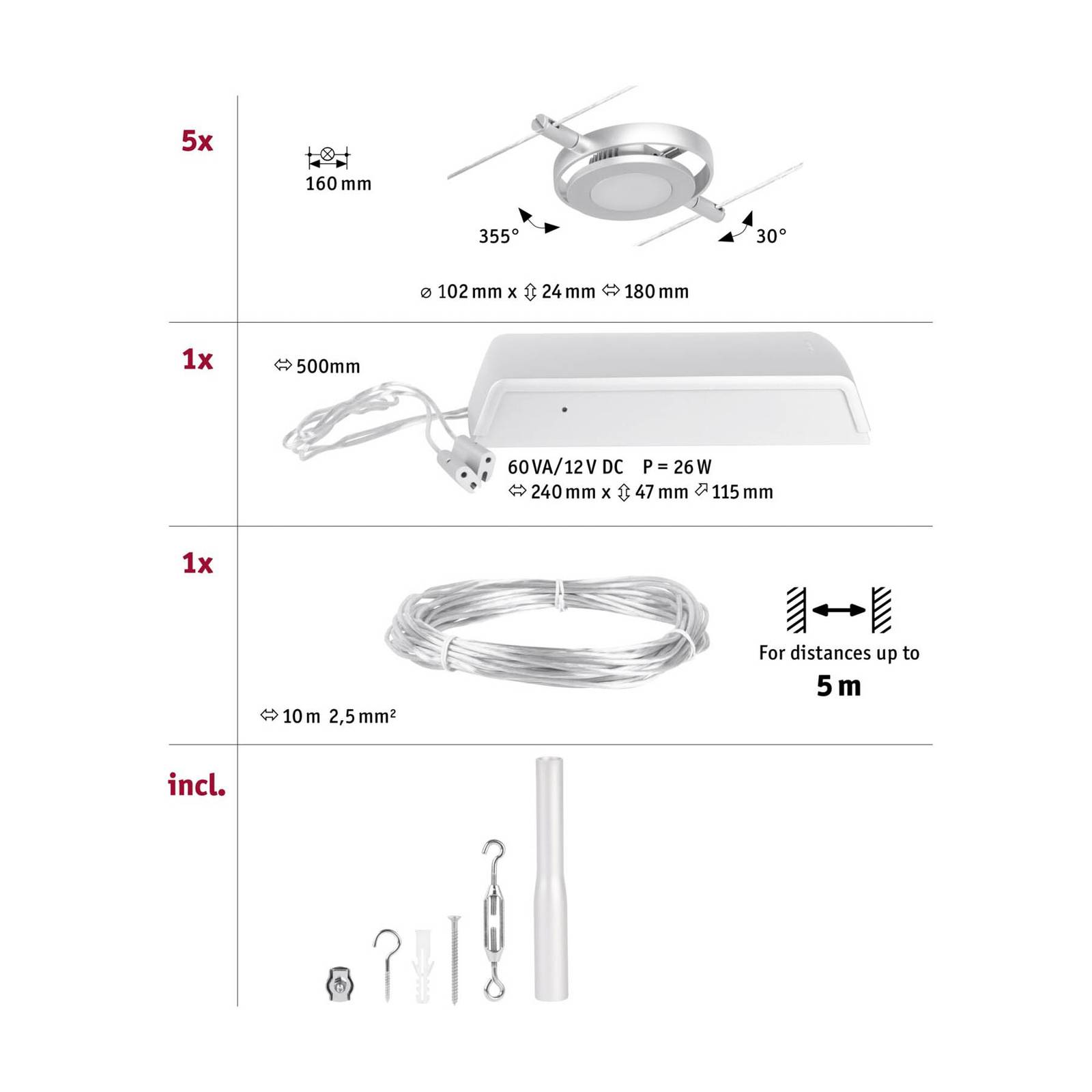 Paulmann Wire RoundMac LED lankový systém 5x chrom, Chodba, kov, 4.5W, P: 500 cm, L: 16 cm