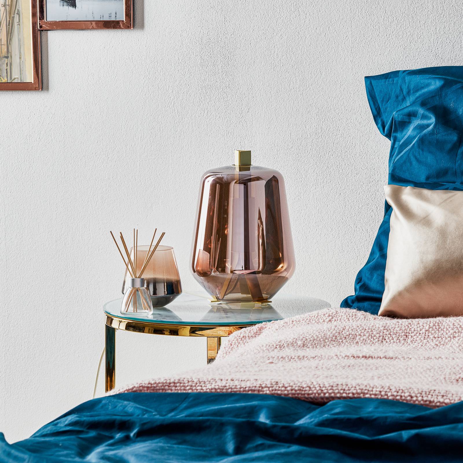 Prandina Luisa T1 stolní lampa 2 700K mosaz/růžová, Obývací pokoj / jídelna, sklo, foukané, 8W, K: 28.5cm