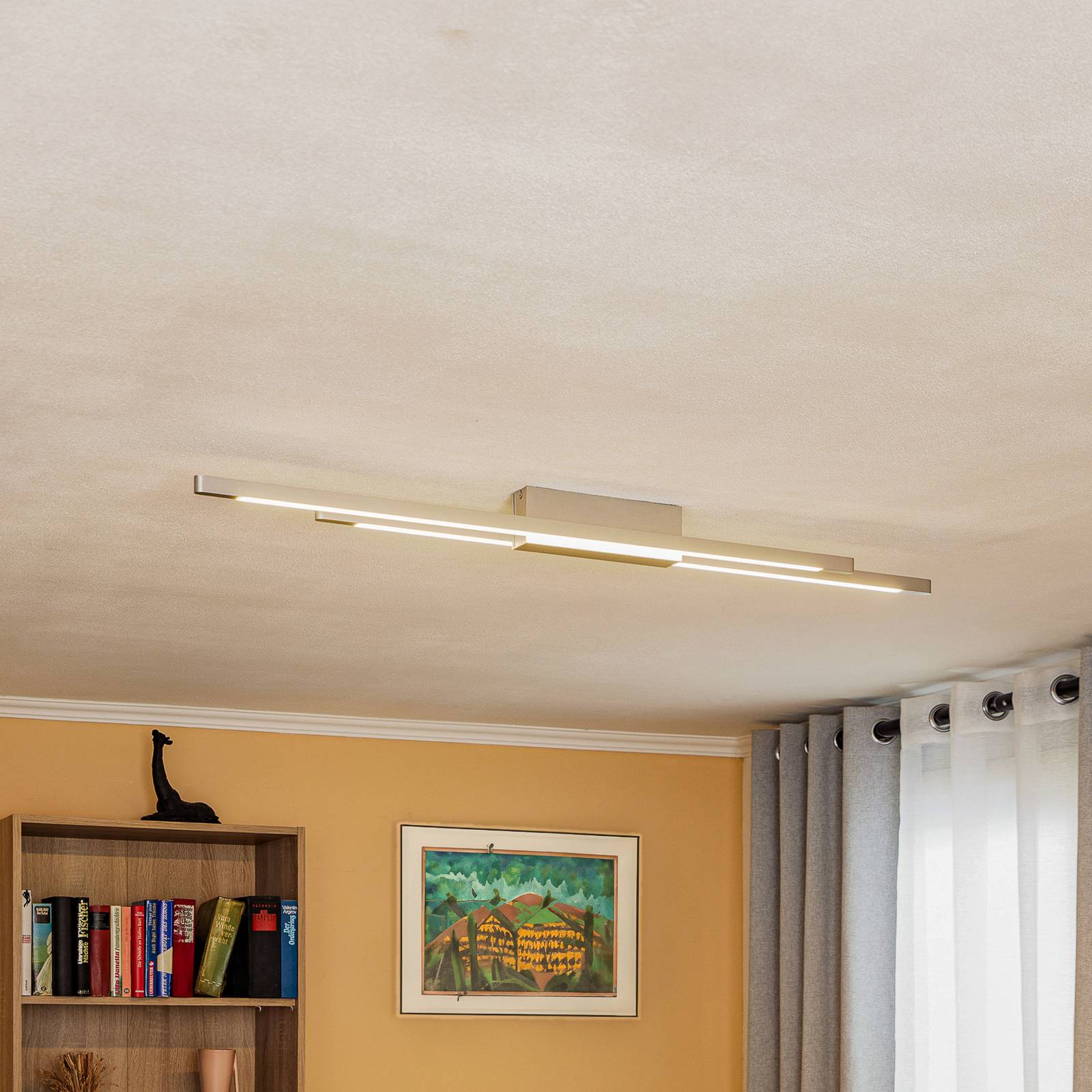 quitani Stropní svítidlo Quitani LED Keijo, nikl/dub, Obývací pokoj / jídelna, Dubový masiv, hliník, ocel, mosaz, 21W, P: 103 cm, K: 2cm