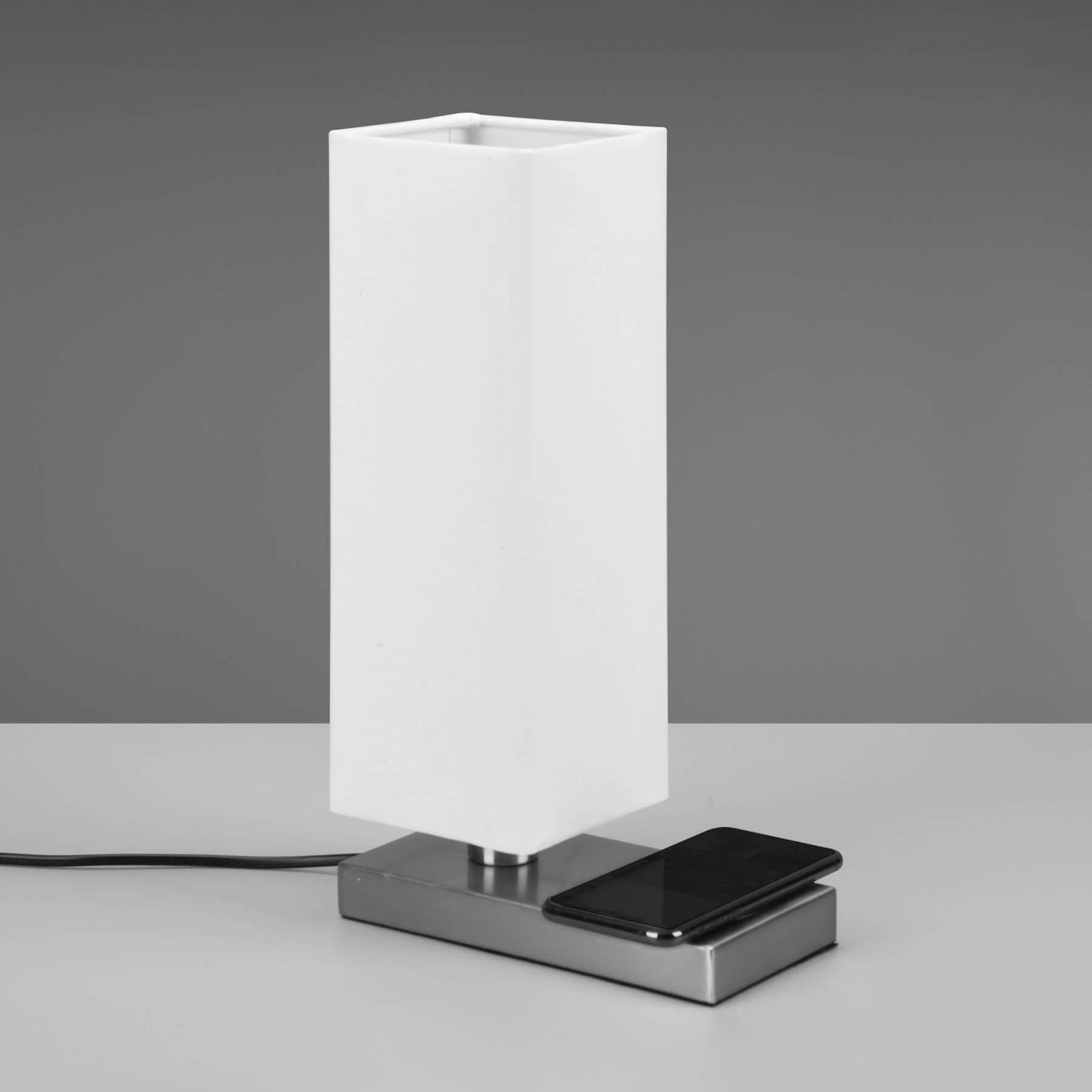 Reality Leuchten Stolní lampa Haley s nabíjecí stanicí, bílá/nikl, Obývací pokoj / jídelna, železo, textilní výrobky (bavlna, polyester), E14, 40W, P: 20 cm, L: 10 cm, K: 35cm