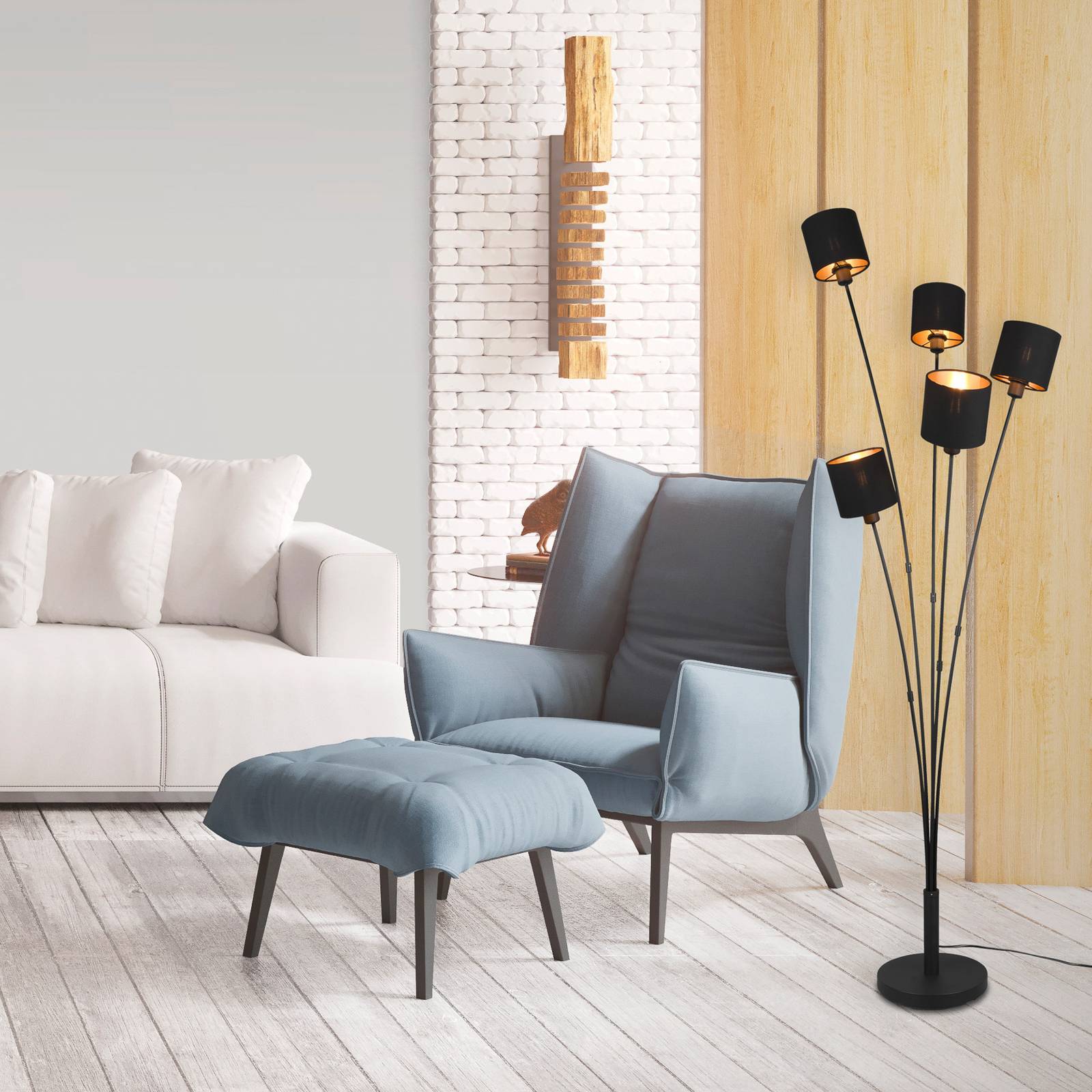 Reality Leuchten Stojací lampa Tommy, černá/zlatá, výška 163 cm, tkanina s 5 světly, Obývací pokoj / jídelna, Kov, tkanina, E14, 28W, P: 48 cm, K: 163cm