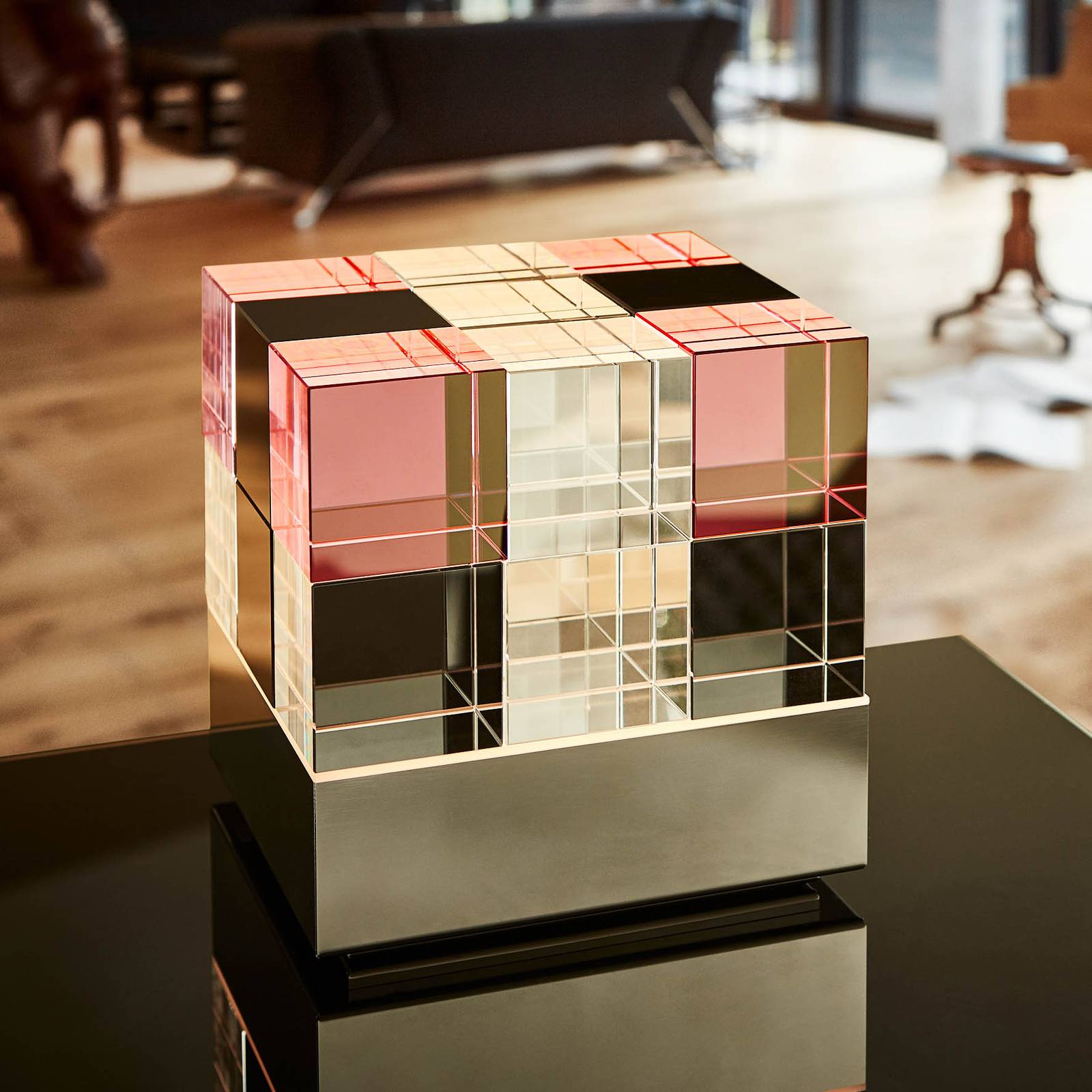 TECNOLUMEN Stolní lampa Cubelight Move, růžová/černá, Obývací pokoj / jídelna, Sklo, nerezová ocel, 12W, Energetická třída: F, L: 15 cm, K: 15cm