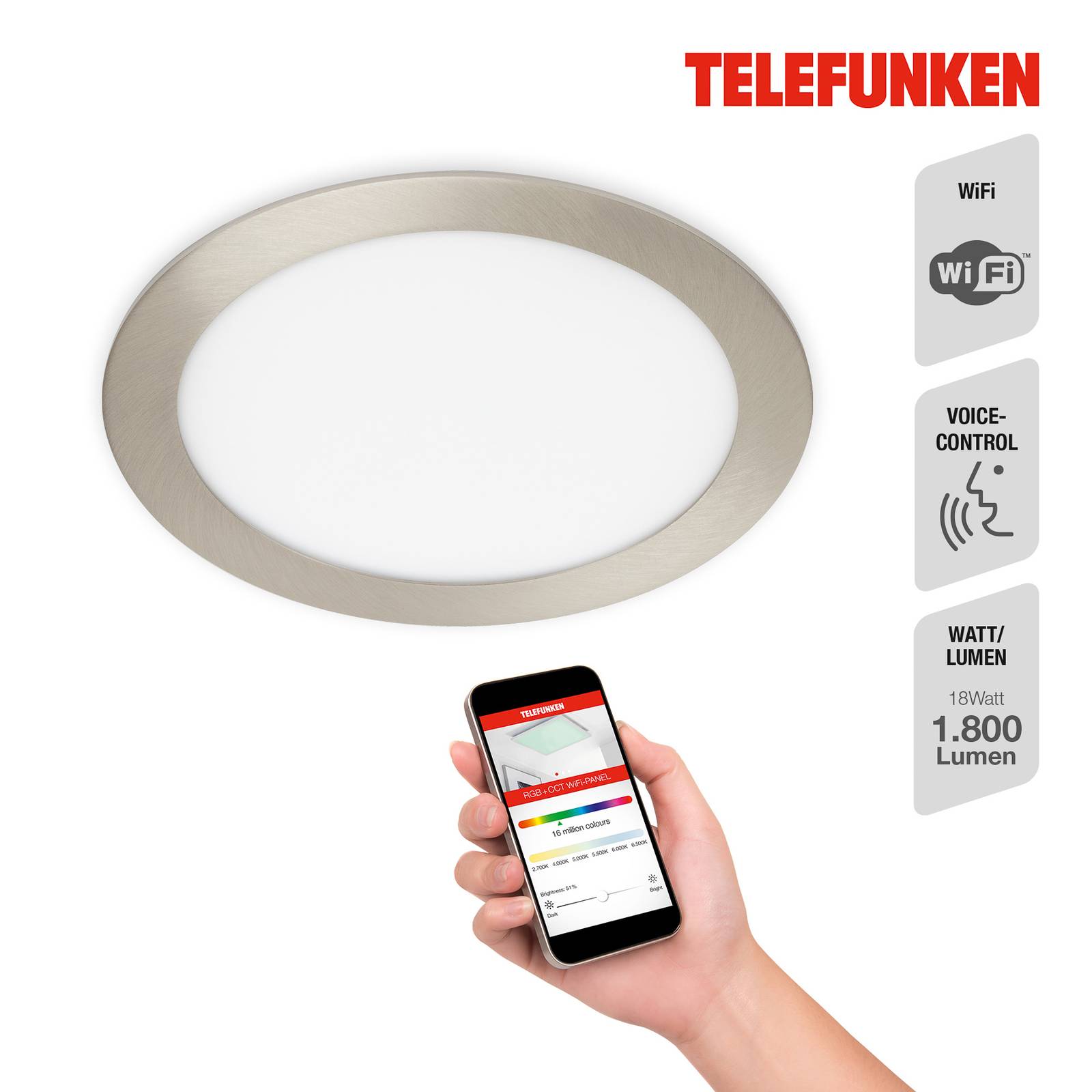 Telefunken LED panel centreback CCT RGB 45x45cm bílý, Obývací pokoj / jídelna, plast, kov, 24W, Energetická třída: F, P: 44.5 cm, L: 44.5 cm, K: 6.3cm