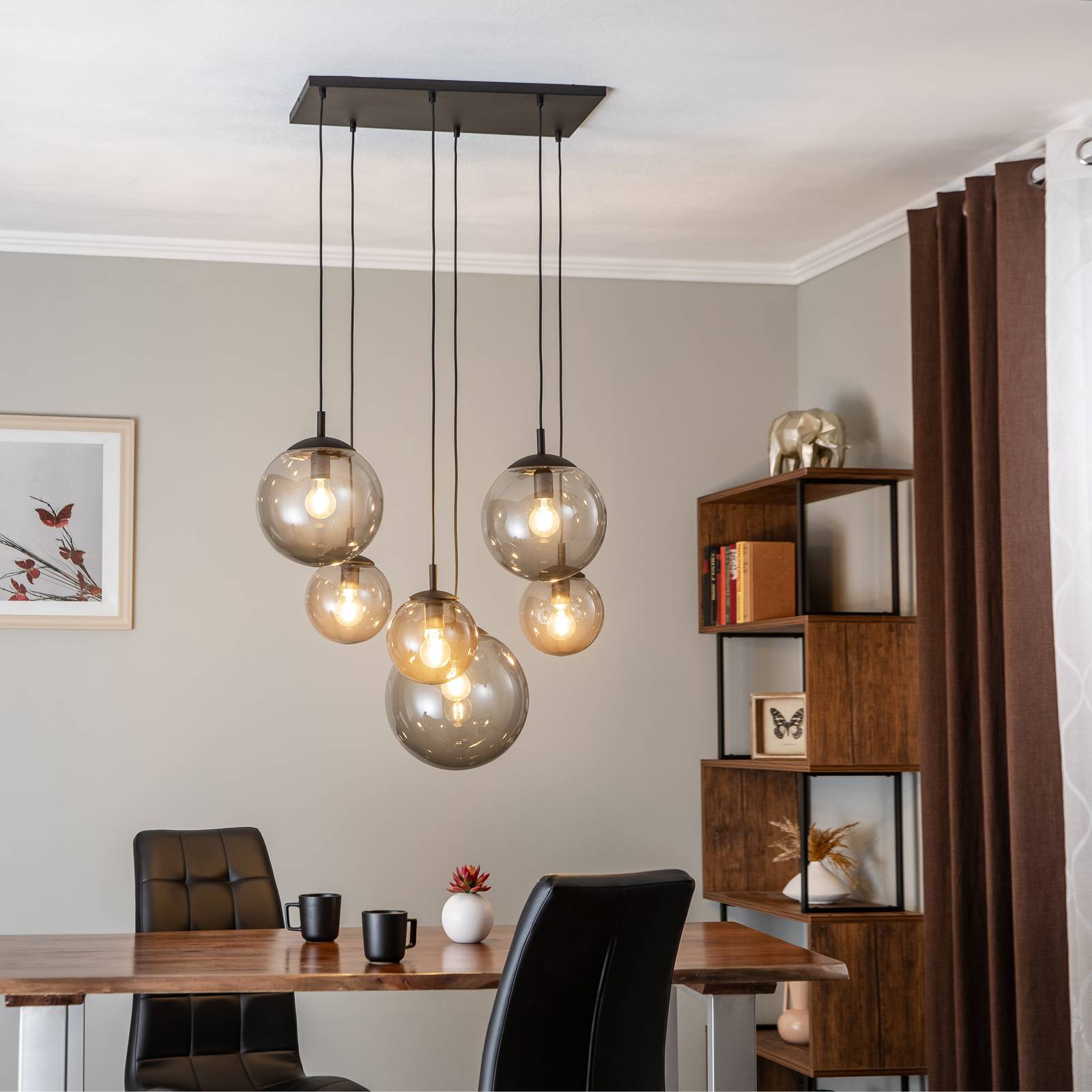 TK Lighting Závěsné svítidlo Esme, sklo, grafitově průhledné, 6 světel, obdélníkové, Obývací pokoj / jídelna, Sklo, ocel, E27, 15W, P: 77 cm, L: 47 cm