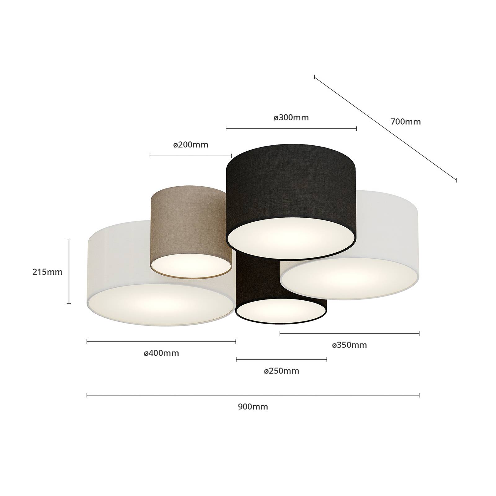 Trio Lighting Hotelové stropní světlo s pěti test.stínidly, Obývací pokoj / jídelna, textil, E27, 42W, P: 90 cm, L: 70 cm, K: 21.5cm