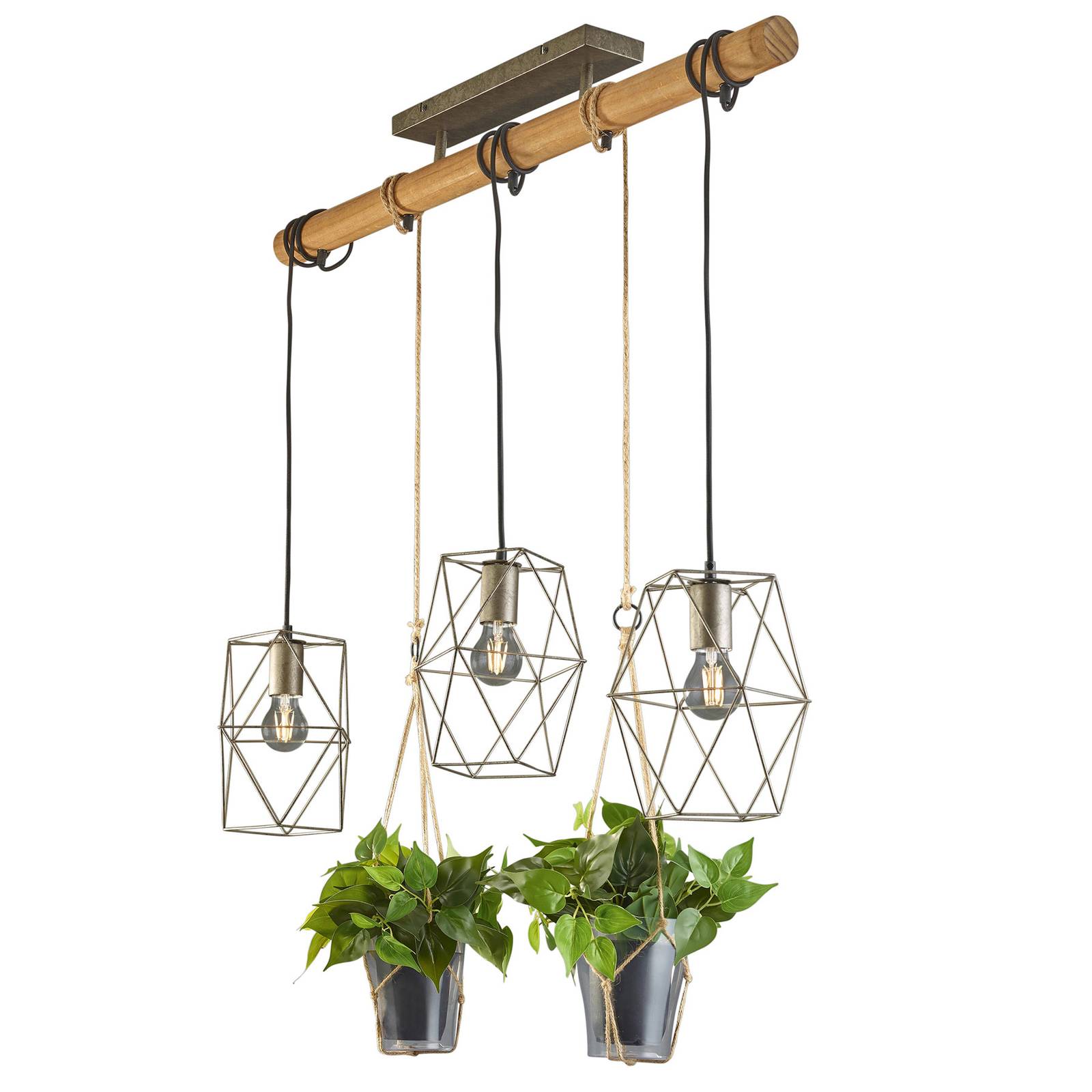 Trio Lighting Závěsné světlo Plant, 3 zdroje skleněná vložka, Obývací pokoj / jídelna, kov, sisal, sklo, dřevo, E27, 10W, P: 115 cm, L: 22 cm